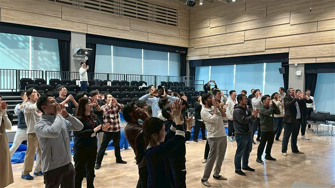 次に、アイスブレイクエクササイズとして、人間輪投げを行いました。身体を使ったエクササイズで、言語を主としないコミュニケーションで盛り上がりました。