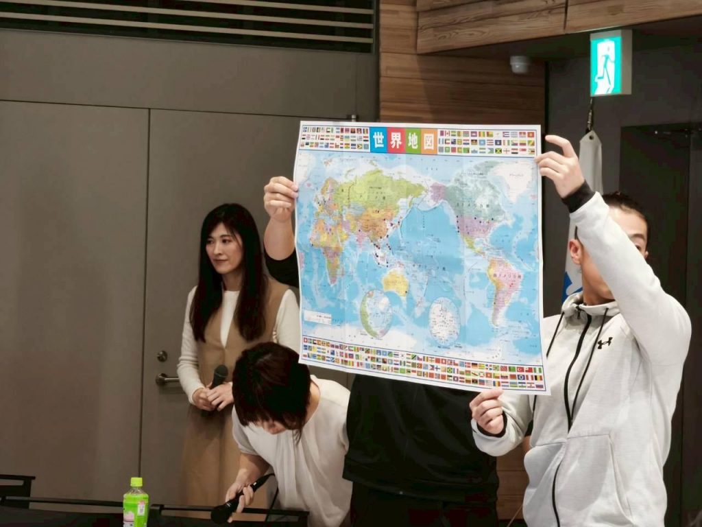 友達のいる国に印をつけた世界地図に、本日の参加者の出身国の印も加え一気に交友の輪が広がったことを視覚化しました。
