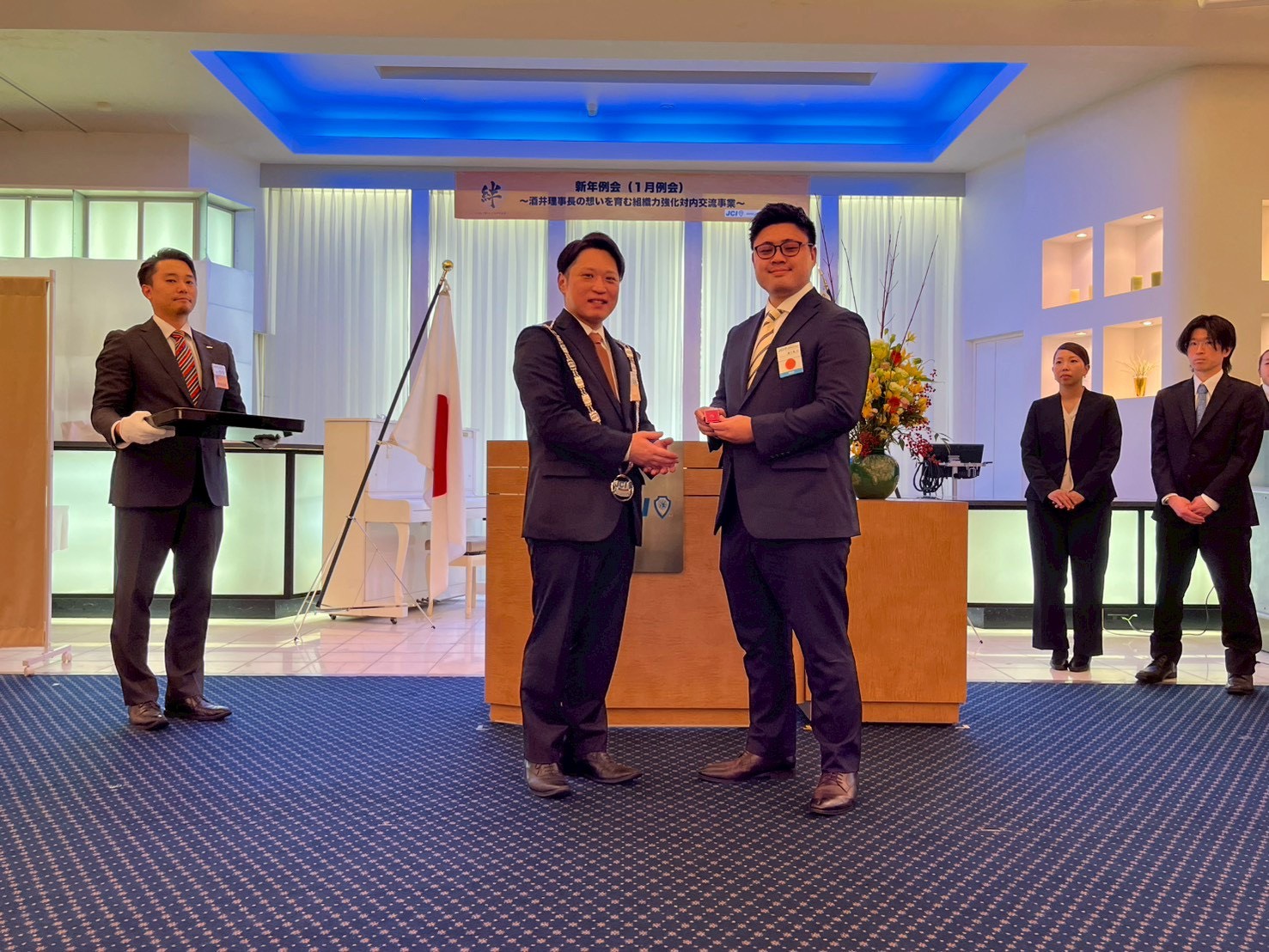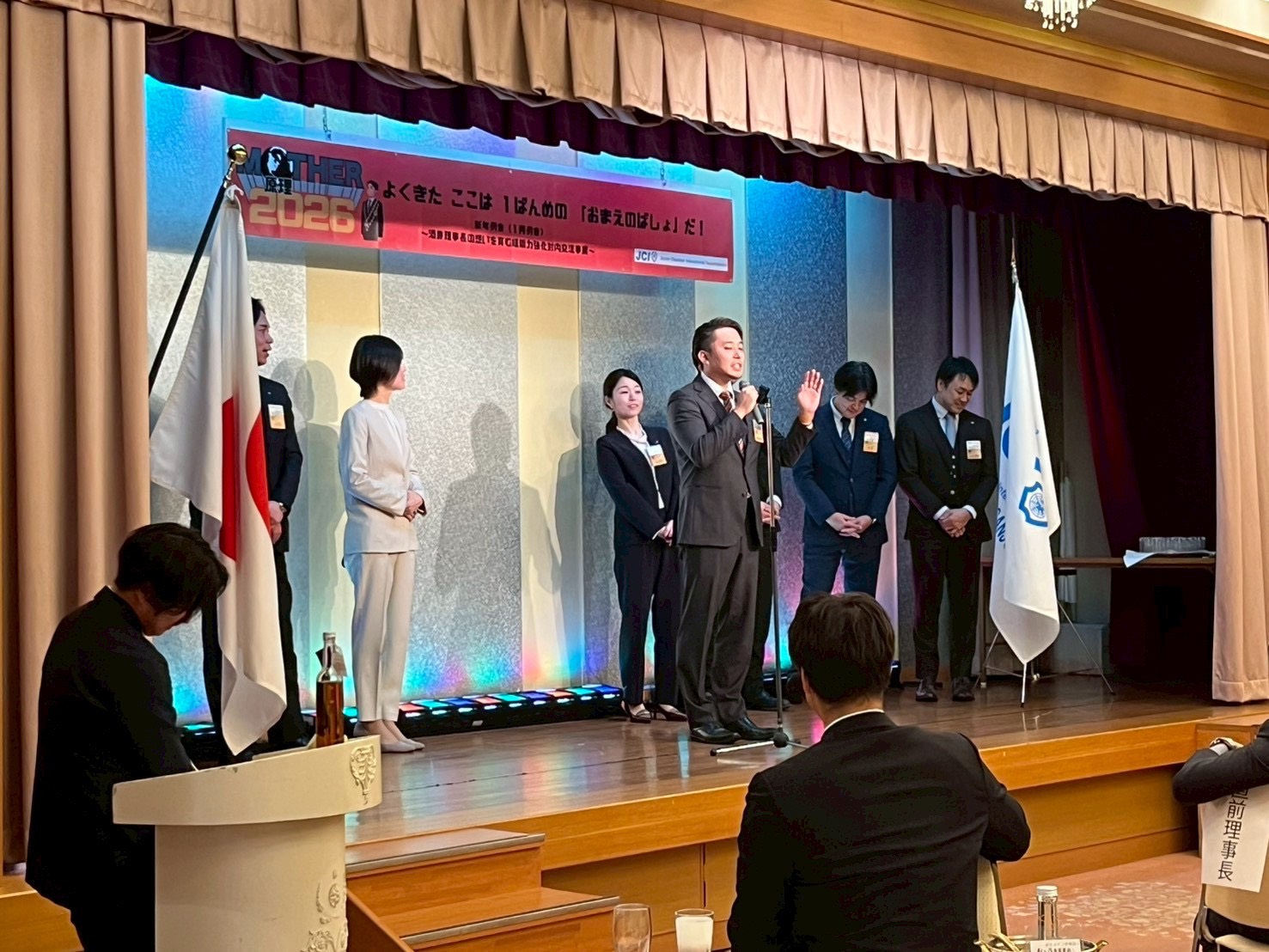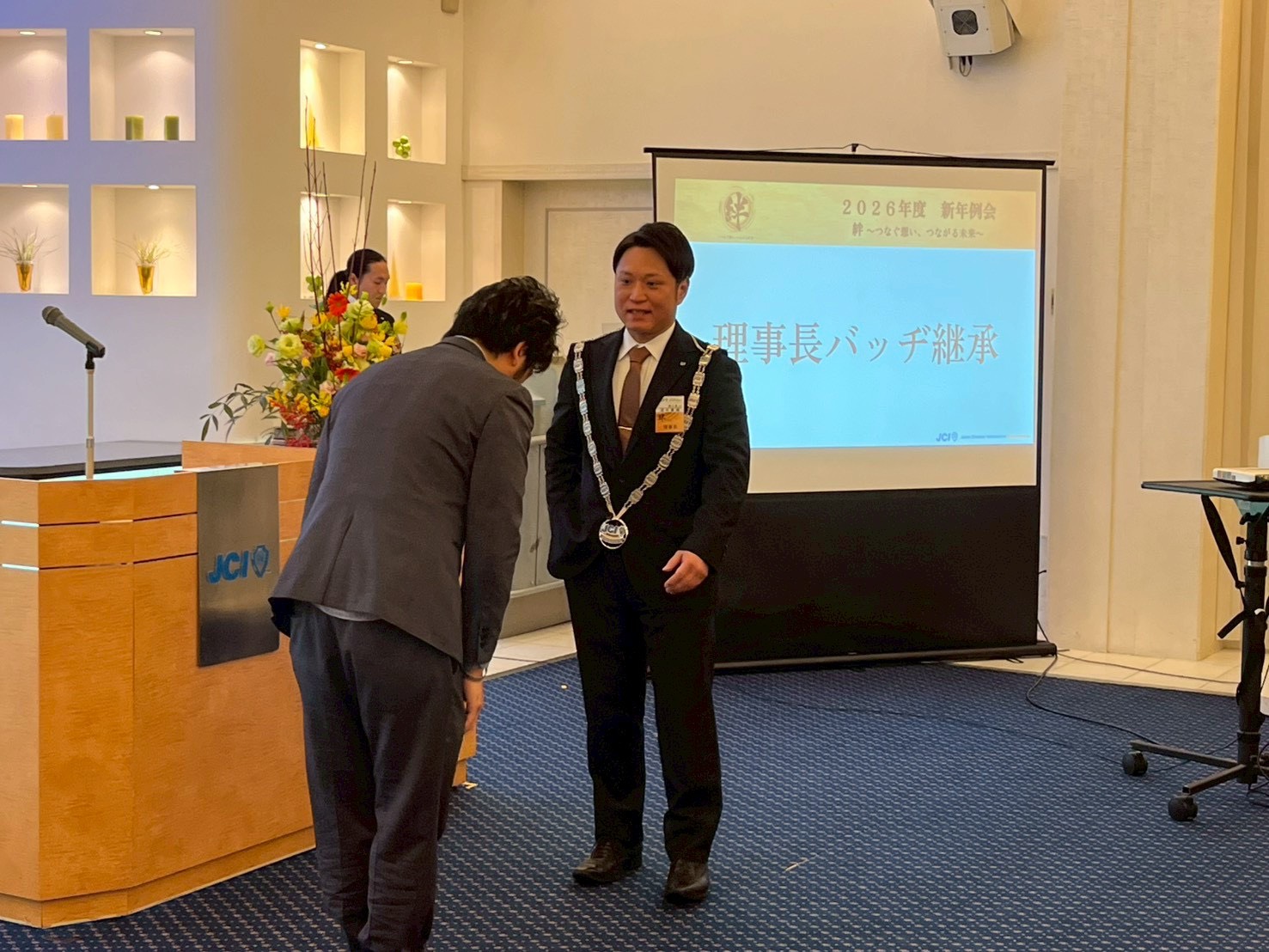 齋藤直前理事長より酒井理事長(第30代)へ理事長バッジの継承が行われ、2026年度燕三条青年会議所の新体制がスタートとなりました。