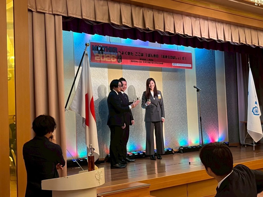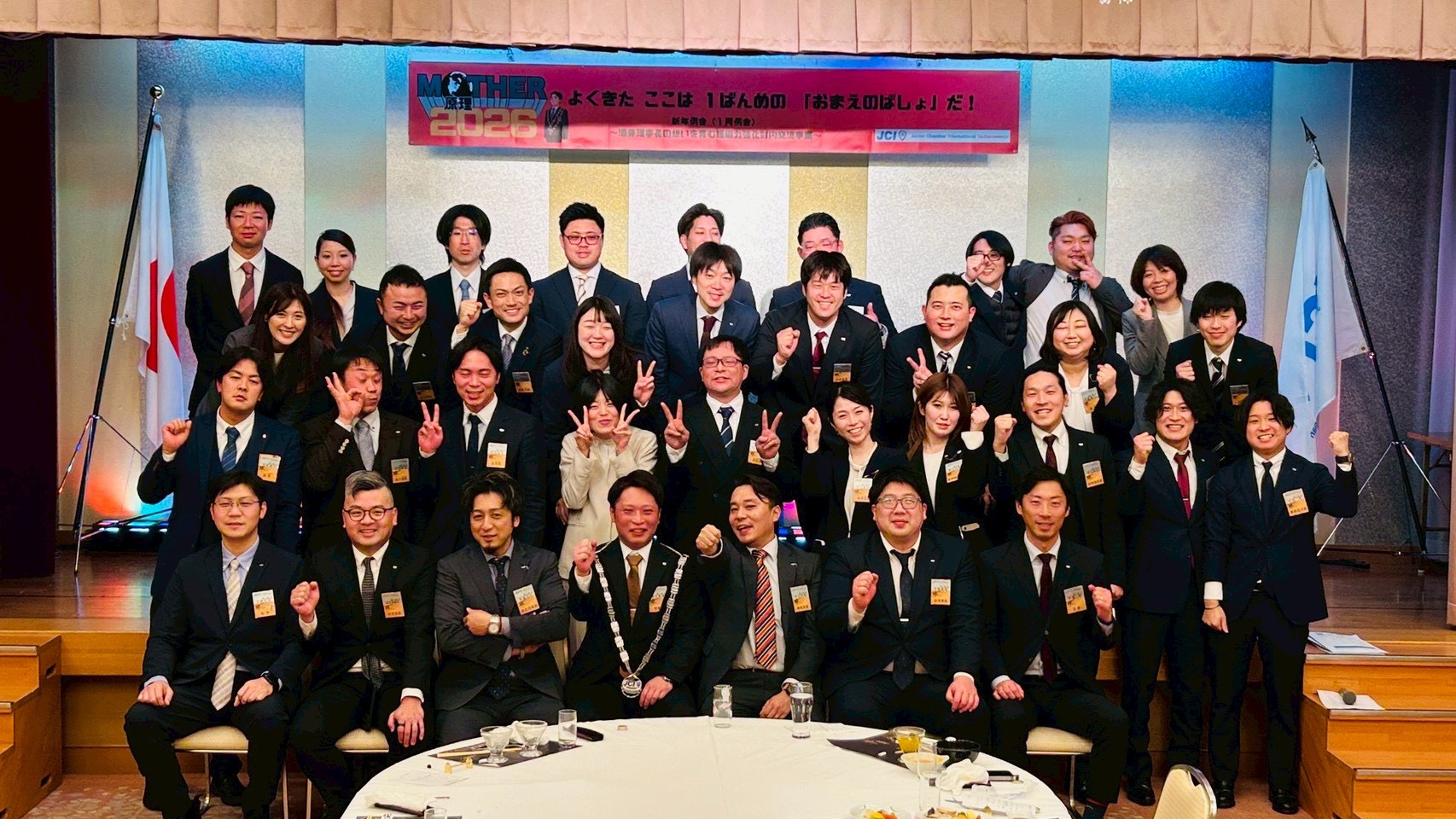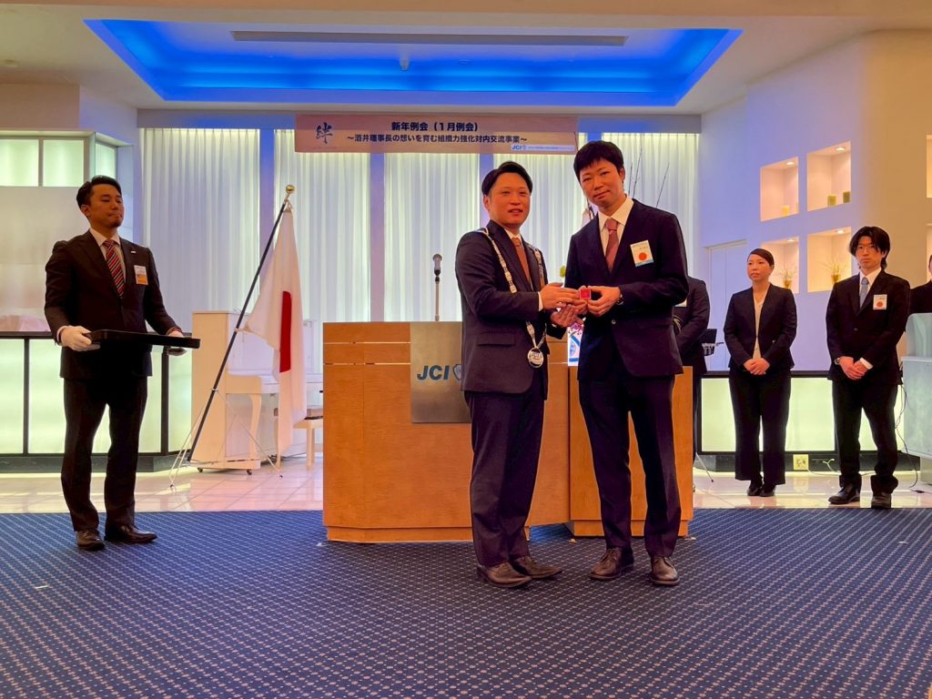 齋藤直前理事長より酒井理事長(第30代)へ理事長バッジの継承が行われ、2026年度燕三条青年会議所の新体制がスタートとなりました。