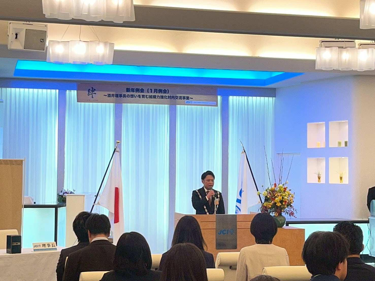 そして酒井理事長より新年のご挨拶があり、今年度スローガンである「絆~つなぐ想い、つながる未来~」に込めた想いをお話していただきました。メンバーは酒井理事長の想いを理解し、1年間の活動に邁進していく機運を高めました。