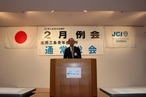 落合理事長2月例会挨拶。今後の燕三条JCが一般社団法人か公益社団法人のどちらかに進むべきかに関するお話しをされました。